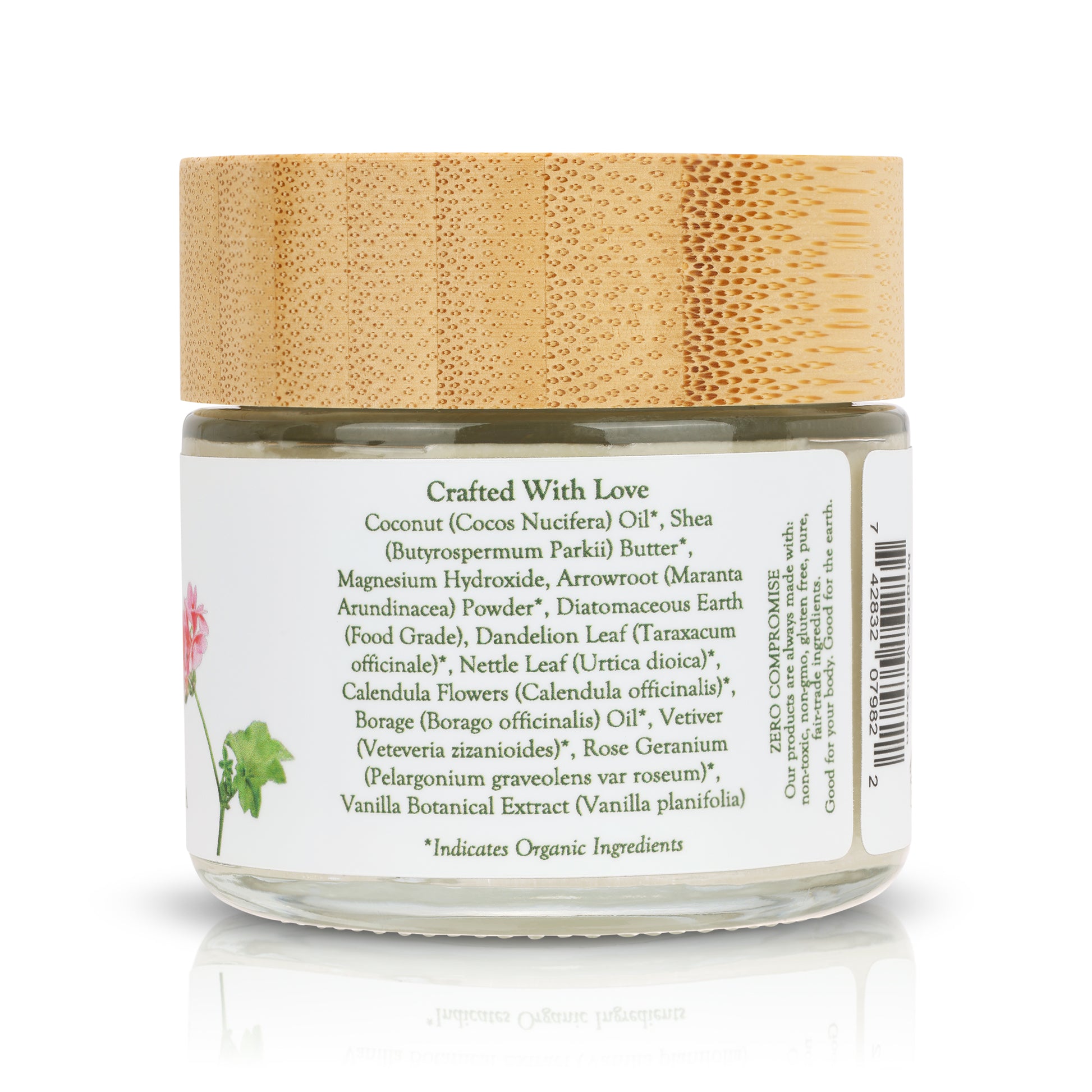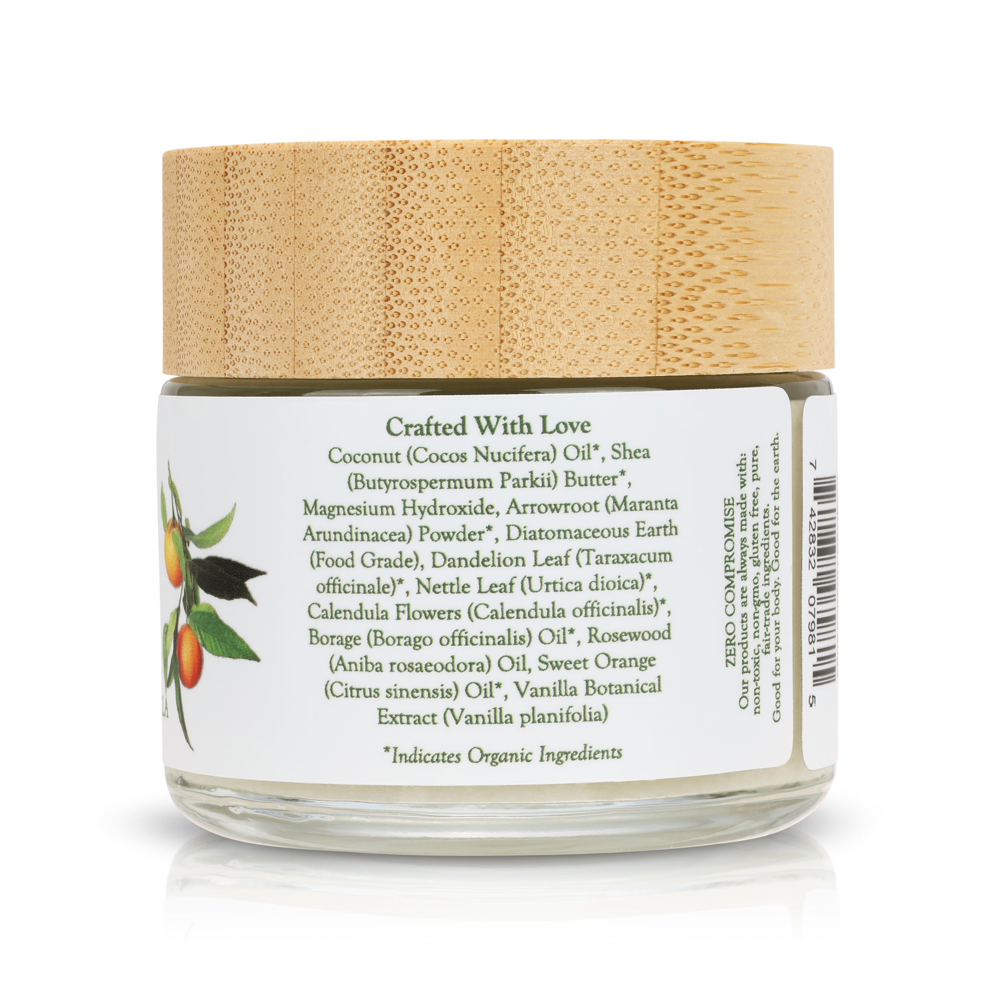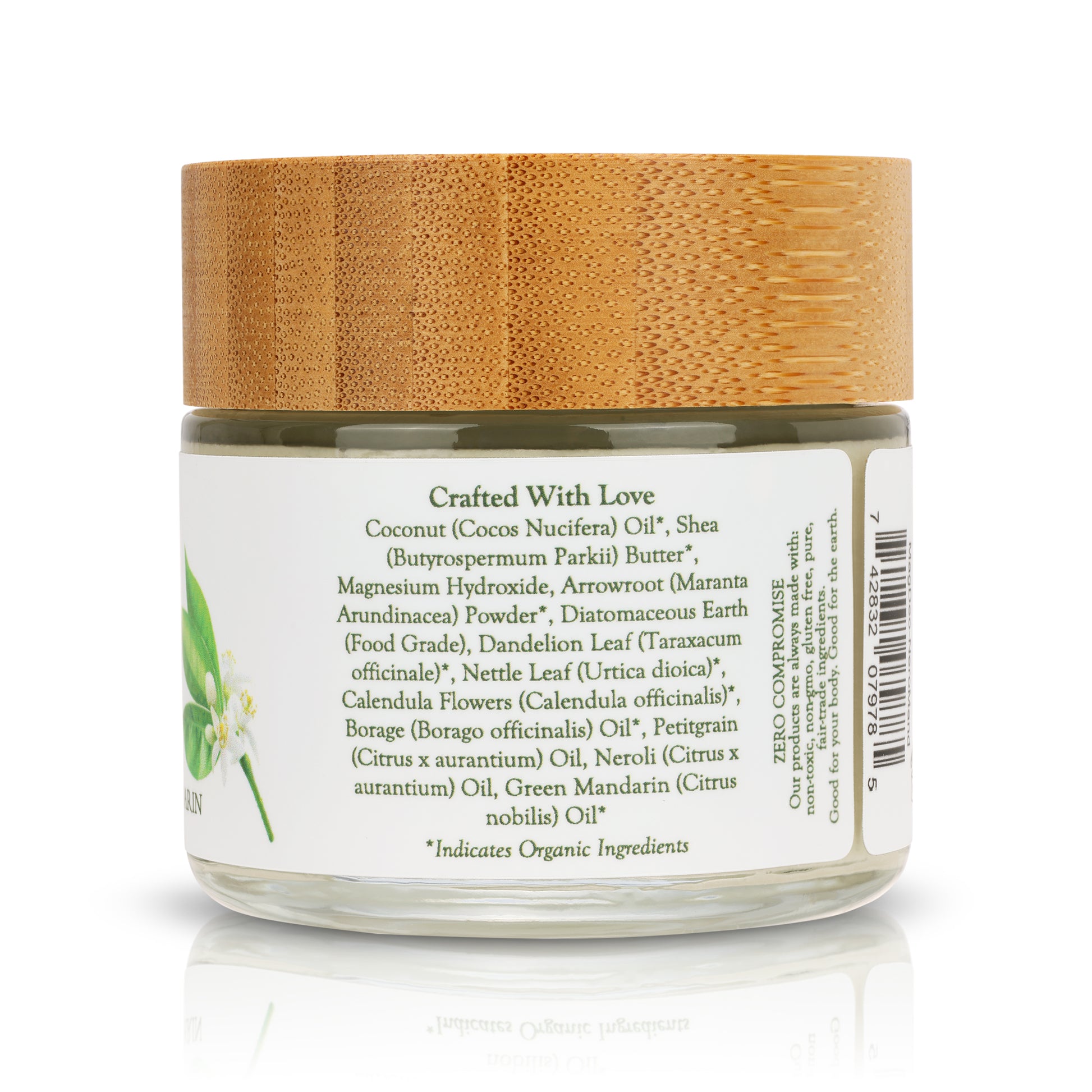 Coconut (Cocos Nucifera) Oil*, Shea (Butyrospermum Parkii) Butter*, Magnesium Hydroxide), Arrowroot (Maranta Arundinacea) Powder*, Diatomaceous Earth (Food Grade), Dandelion Leaf (Taraxacum Officinale)*, Nettle Leaf (Urtica Dioica)*, Calendula Flowers (Calendula Officinalis), Borage (Borago Officinalis) Oil*, Essential Oil Blend (Different blend for each kind)
